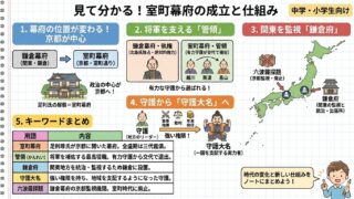室町幕府と鎌倉幕府のちがいはどこにある?将軍を支える「管領」や、関東を治める「鎌倉府」の役割を、社会人先生がわかりやすく解説。有力な守護が「守護大名」へと成長していく過程など、高校入試に出る重要ポイントを絞ってまとめました。記述問題対策も完備!