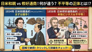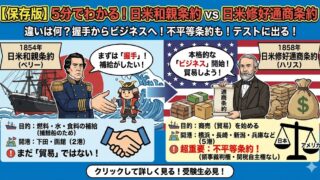 ペリーとハリス、どっちがどっち?日米和親条約と日米修好通商条約の違いを中高生向けにスッキリ解説。捕鯨の理由から、領事裁判権・関税自主権という不平等の正体まで、テストに出るポイントを網羅。幕府の必死な交渉の裏話も!