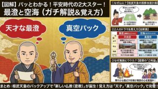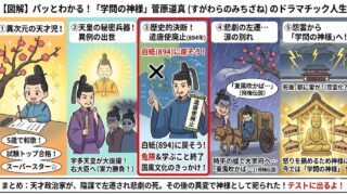 「学問の神様」菅原道真ってどんな人?5歳で和歌を詠んだ天才の生涯から、遣唐使廃止(894年)の功績、大宰府への左遷と飛梅伝説、そして怨霊から神様になった驚きの理由まで、小中高生向けにスッキリ解説!テスト頻出の記述対策も完備。