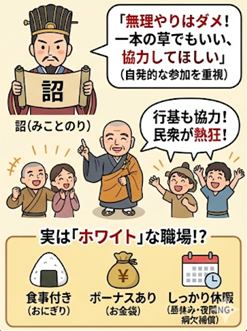 普通、これほどの大工事なら「無理やり働かされた(強制労働)」と思われがちですが、聖武天皇が出した「詔(みことのり:天皇のお言葉)」には驚きの内容が書かれていました。