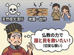 当時の日本は、天然痘(てんねんとう)という恐ろしい伝染病が大流行し、大地震や凶作などの災害も続いていました。まさに「国滅亡のピンチ」だったのです。