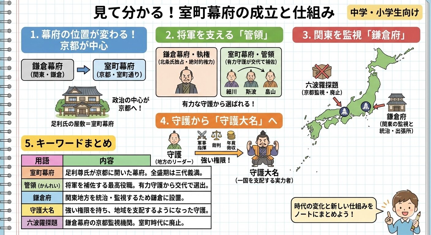 管領・鎌倉府・守護大名。この3つのキーワードを、鎌倉時代との違いを意識しながら覚えるのが点数アップの近道です!