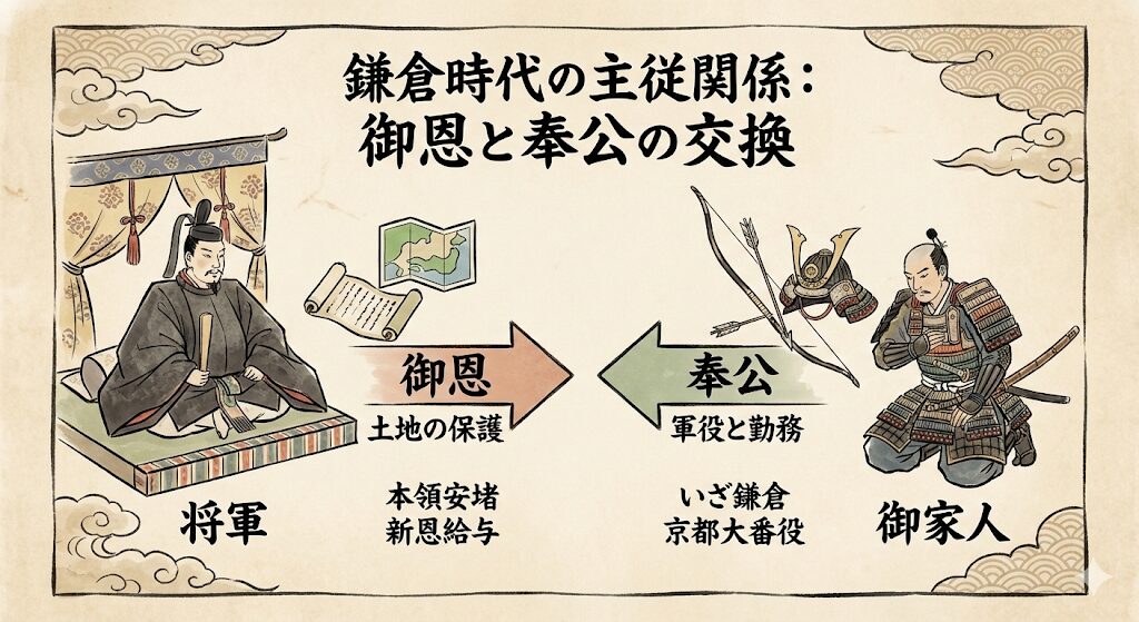 鎌倉幕府は「御恩(将軍が土地を認める)」と「奉公(武士が命がけで戦う)」というギブ・アンド・テイクで成り立っていました。