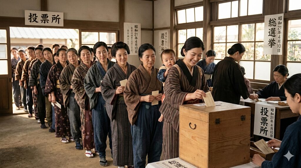 市川房枝さんや平塚らいてうさんたちが大正時代から必死に戦ってきた「女性参政権」が、ここでついに実現したのです。これでようやく、本当の意味での「普通選挙」が完成しました。
