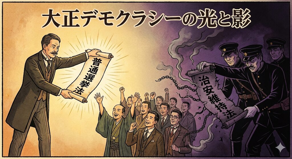 - 政府のガード: 同時に、激しい社会運動を弾圧するための治安維持法も制定されました(アメとムチ)。