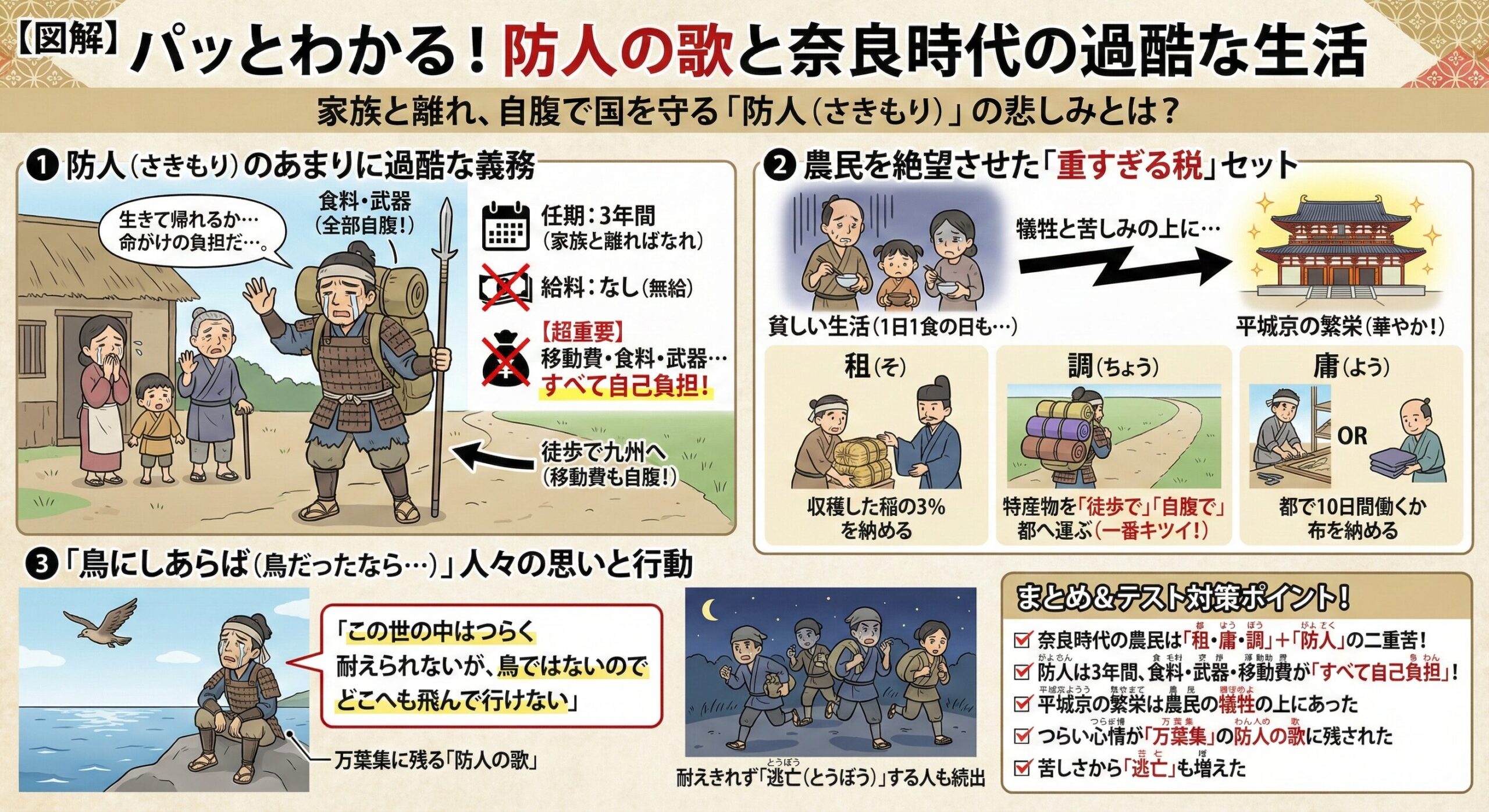 - 調(ちょう):絹や特産物を徒歩で平城京まで運び、納める。その間の食料や宿代も自己負担 。