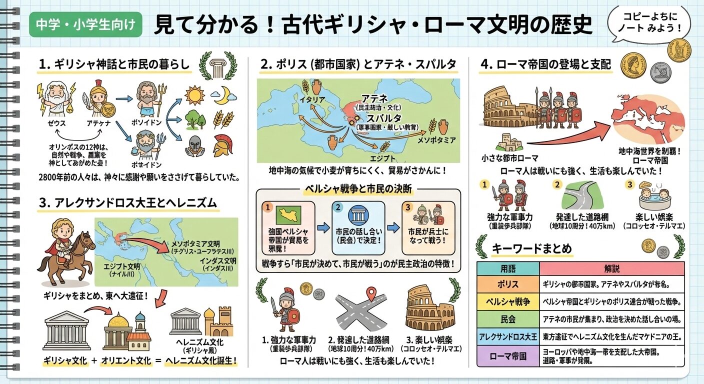 この記事では、古代ギリシャの文化や民主政治、アレクサンドロスの東方遠征、ローマ帝国の発展までを、中学生にもやさしく楽しく解説!社会のテストにも自由研究にもバッチリ対応!