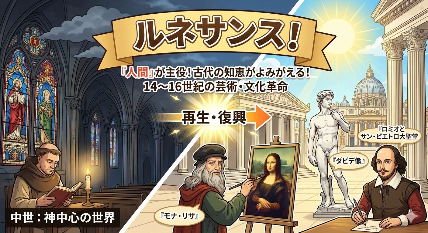 この記事では、イタリアからはじまったルネサンスの意味や代表的な作品・人物を、中学生にもわかりやすく紹介します。ひげ男爵風に言えば…「古代ローマやギリシャ文明を学びなおすこと〜!」