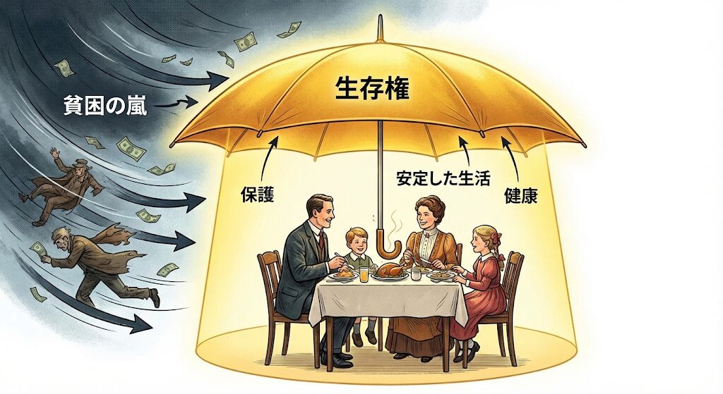 - 生存権(せいぞんけん): 「国は、国民が健康で文化的な最低限度の生活を送れるように責任を持たなきゃいけない」という考え方。今の日本国憲法25条のルーツです!