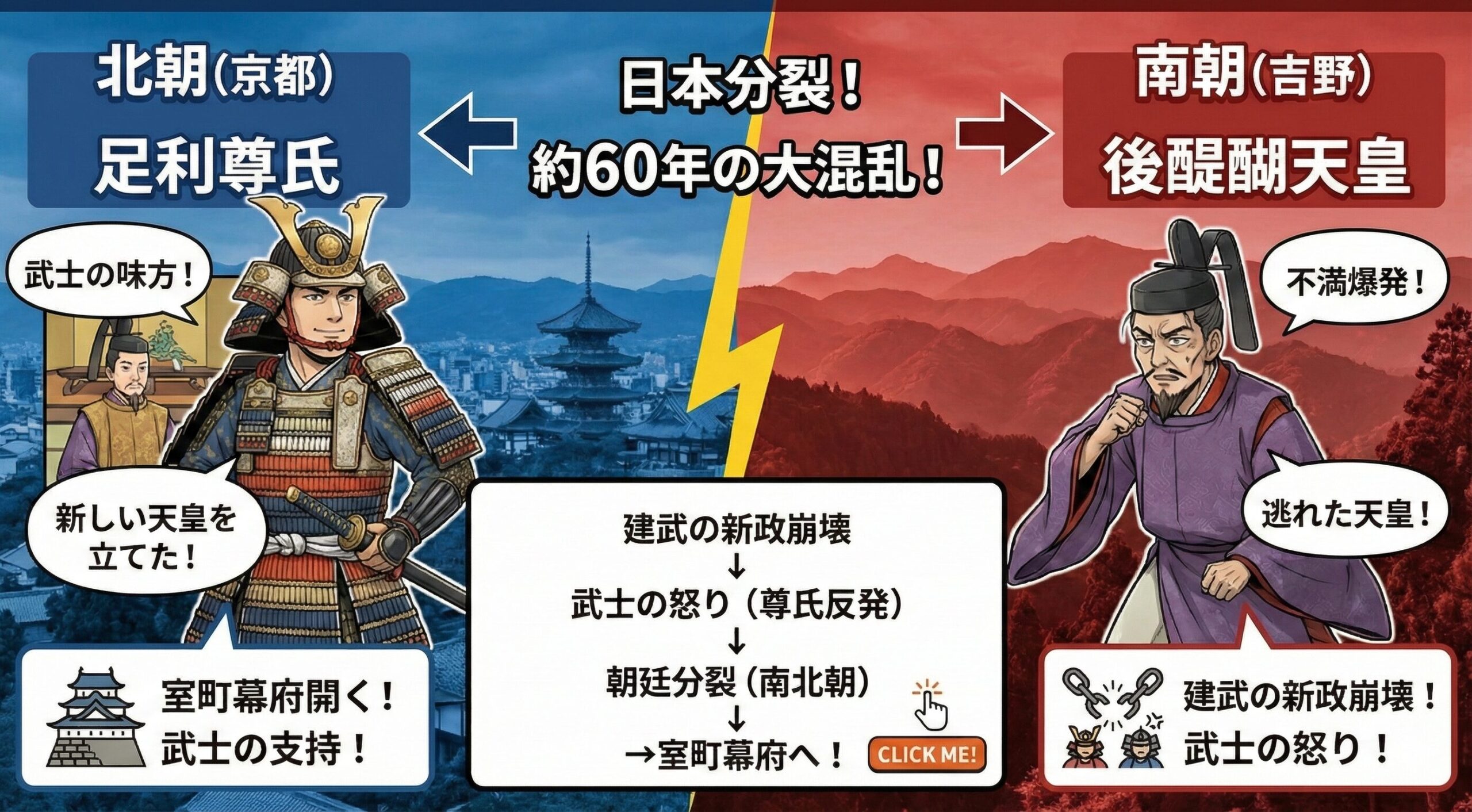 こうして、日本に天皇が2人並び立つ 南北朝時代 がここから約60年間続くことになります。