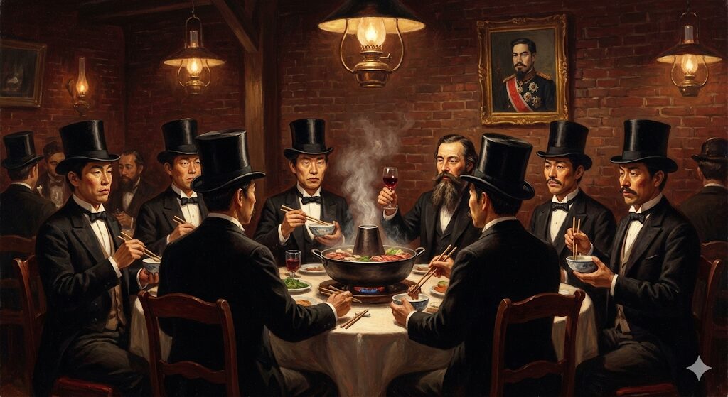 - 明治=牛鍋(すき焼き):「肉を食べるのは文明人の証!」
