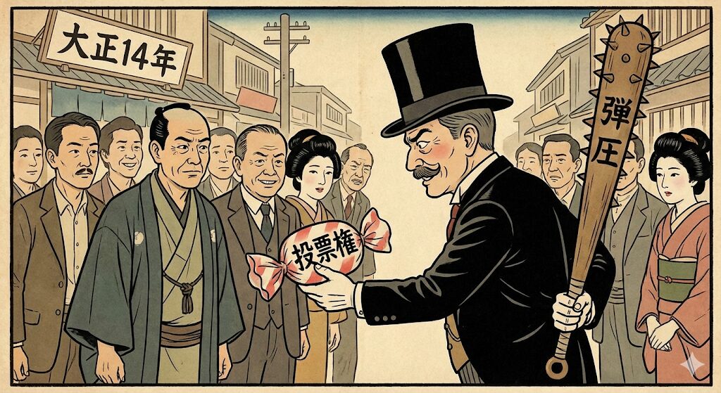 1925年(大正14年)。この年は、日本の政治が「国民全員(男子)」に心を開いた記念すべき年であり、同時に「国民の自由」に厳しく鍵をかけた年でもありました。