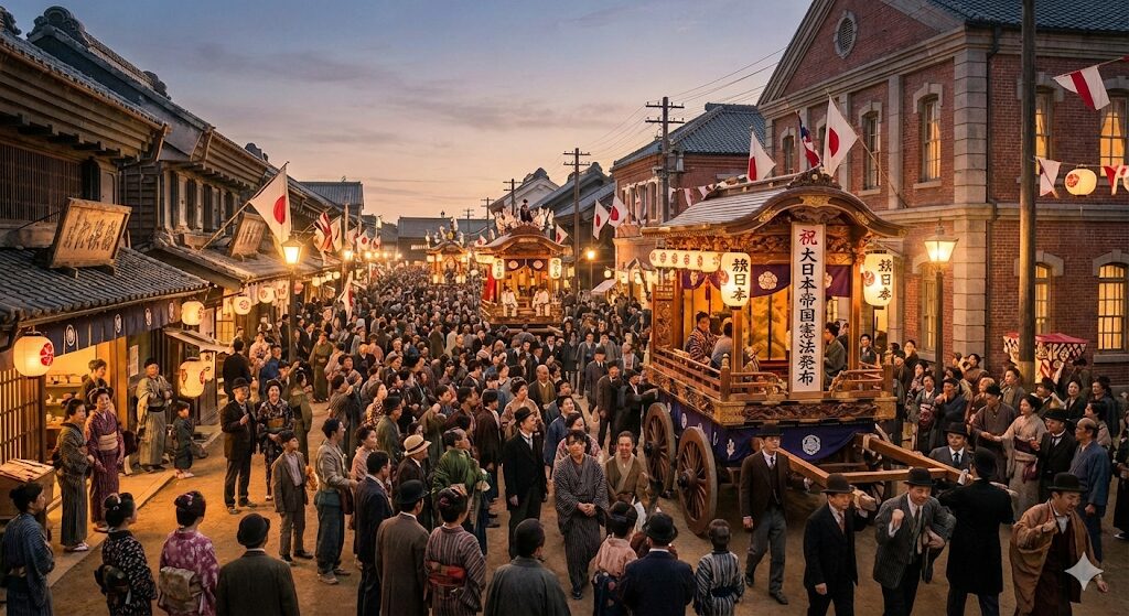 1889年2月11日。当時の東京では、お祭り騒ぎが起きていました。山車や仮装行列が町を練り歩き、人々は万歳三唱!